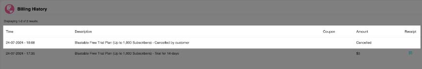 6. You can also confirm your plan was canceled by checking your billing history at the bottom of the page.