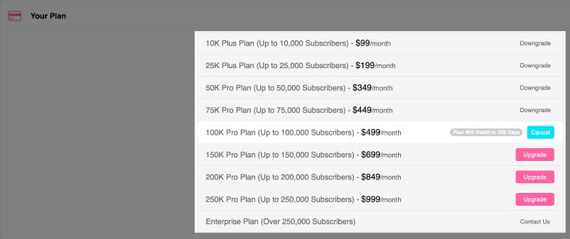 Our Pro Plans start with our 50K Pro which is $349 per month. Pro plans go up from there depending on the number of subscribers.