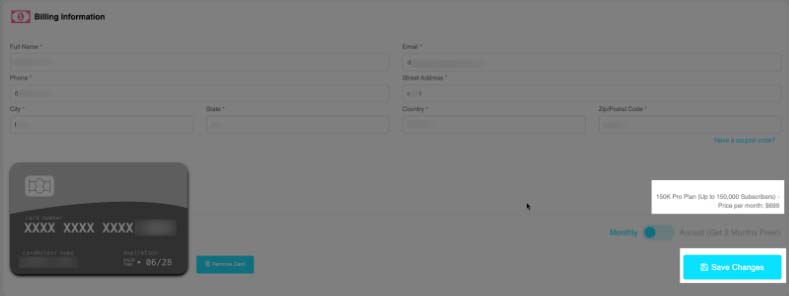 4. You will be taken to the Billing section to confirm the new plan. Click on Save Changes.